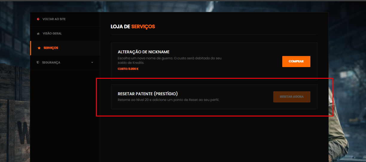 Vá até a Loja de Serviços dentro do painel do jogador e clique no botão "Resetar Agora" na opção Resetar Patente (Prestígio).